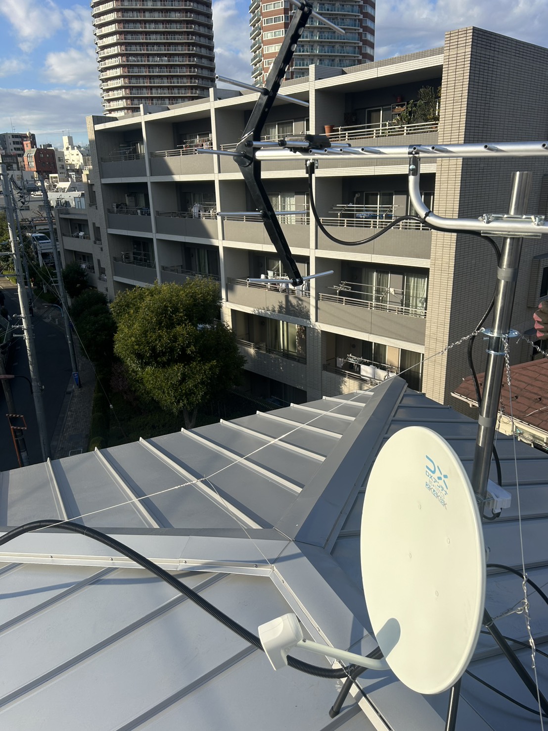 現地で詳しく電波状況を調査し、受信レベルが十分に確保できる屋根上へ地デジアンテナを設置しました。仕上がりもすっきりとまとめ、工事後は全チャンネルがクリアに映ることを確認。「費用面も今後安心できるし、依頼して良かった」とご満足のお声をいただきました。